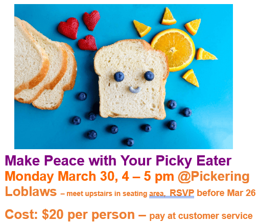 Do you have a little one at home who is testing your patience at mealtime? Are you tired of feeling like you need to make multiple meals to please different palettes? Your In-Store Dietitian, Lisa, is here to help you quit the food fight! During this interactive workshop your dietitian will guide you on how to handle those difficult meal situations, and cover strategies to help increase the variety of foods your little one will eat. We will discuss key nutrients your toddler or preschooler needs for growth and health, and ways to include them into your child’s diet. This workshop involves light walking and spots are limited! Babies and children are welcome. Register today with Lisa.