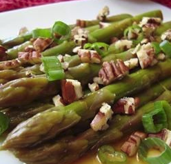 Blanch the asparagus before or after cutting by steaming or microwaving for 1 to 1.5 minutes to soften and bring out the colour.  Quickly dip into cold water to keep the bright green colour.
