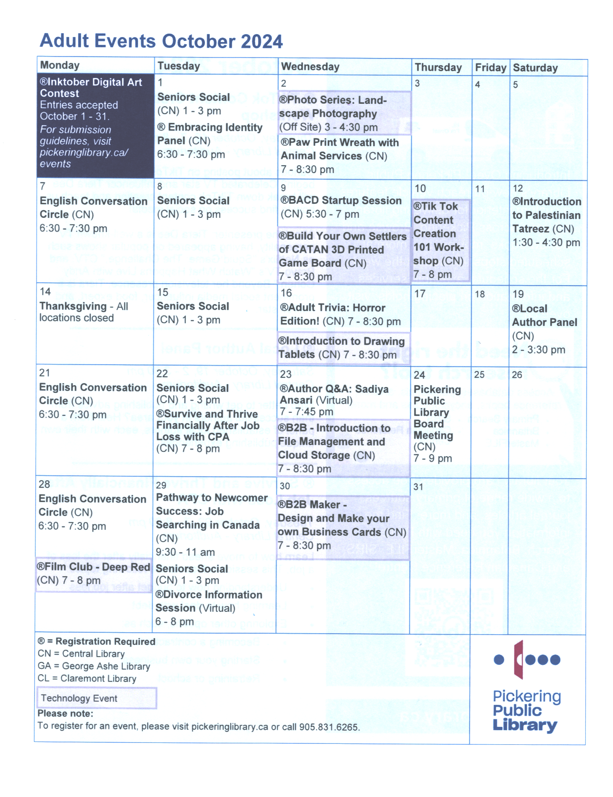 The Pickering Public Library is a tremendous source of information, entertainment and connectivity with others. Explore all the events the PPL is offering for the Month of OCTOBER.
