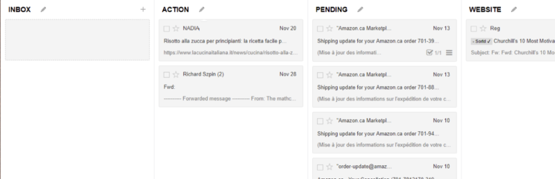 This Inbox has had all its messages dragged into the columns ‘ACTION, PENDING, WEBSITE.’ The Inbox is now empty and will be populated by new Gmails as they are received.
