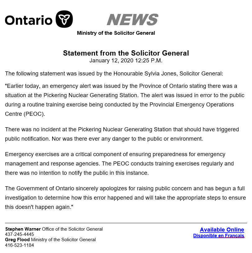 In mid-January, an alert was sent out regarding the Pickering nuclear facility. As it turned out, it was a false alarm. However, the statement issued by the Solicitor General of Ontario raises more troubling questions than relieving the anxiety caused by the alarm.