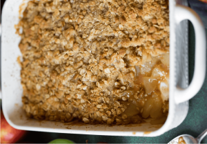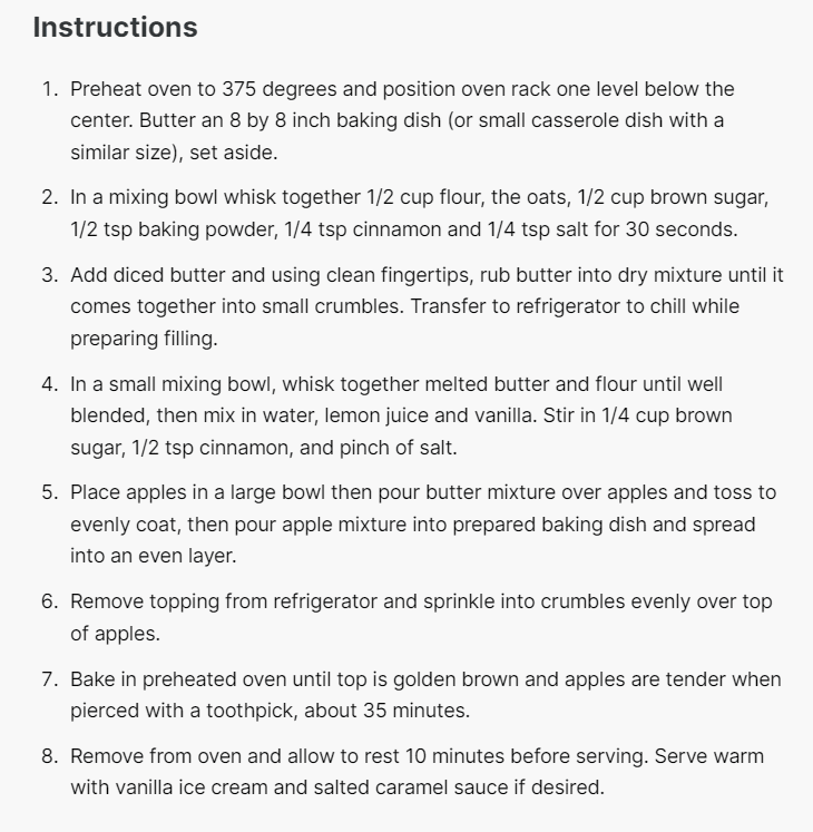 The contents of this apple crisp didn’t work for me, too gluey, and too overworked. I prefer a more natural body and would eliminate all this work. Instead, just cut up the apples, adding lemon juice, brown sugar, cinnamon, and raisins. [I purposely left out amounts as this is a subjective total varying with an individual’s taste. My amounts would likely be too little for others but I want the taste of fresh apples, clean and fresh.