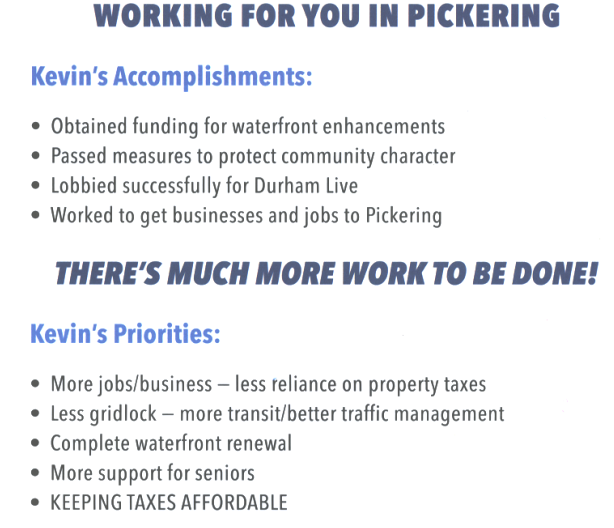 “1 have known Kevin for most of my life. He has always been honest, hardworking and totally committed to every task he takes on. He has been a great Councillor and should be re-elected by the people of Pickering.”