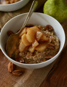 ·1 ½ tbsp. butter or olive oil (non-dairy butter for vegan) ·2-3 tbsp. Brown Sugar ·2 Bosc pears, peeled, cored, and chopped ·¼ tsp. Cinnamon ·1 tbsp. Lemon Juice |