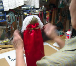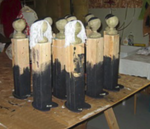First, we began by dissecting and analyzing how the dolls were constructed. Tipping the doll back, we discovered the body consisted of a 4 X 4 block of wood. Easy peasy! But the head, a smoothly rounded block of wood was more difficult. I would not be able to make such a thing but surely any lumber company or home reno store would stock something like that. Our search began and a year later, all we had were dolls, headless. Eventually, we compromised on a solution, fence post tops. They did the job, a bit smaller in diameter, perhaps indicative of Polish cerebral diameters, but smaller would do.