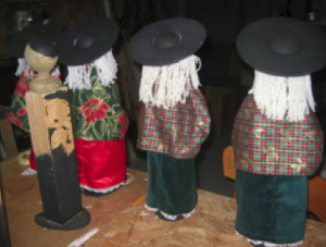 My father-in-law, bless his soul, cut the 4 X 4 blocks for us. Sadly, he never lived long enough to see the finished dolls. My mother-in-law was given the most challenging aspect of costuming the dolls, creating the dresses, the bodices, and the encompassing lacework. The sous chef was project coordinator, parts transporter, and detail painter. A teacher colleague who taught woodwork was recruited for cutting out the “head hats.” My tasks ranged from “hair” pieces to base painting, feet making, and final assembly. Once all the components were found and collected, final assembly was completed within a couple of days.