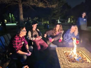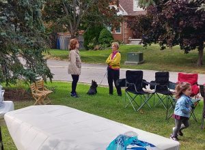 The grassy court at the foot of the street was turned into party central: mini-basketball hoops for the kids, a badminton net for the active adults, propane barbecues, benches and chairs, and tables laden with homemade potluck foods. Two neighbourhood guys, Steve and Darryl manned the bbq’s smokin’ up hot dogs, hamburgers and brats. Table foods went beyond just the basics with Robert’s homebaked pizza, Nadia’s 5-bean medley salad, Kathy’s Macedonian cookies converted to Canadian deliciousness and many other eatables satisfied the hunger pangs of neighbourhood attendees.