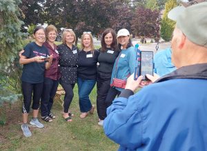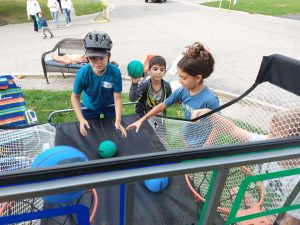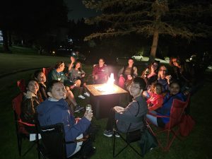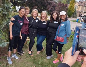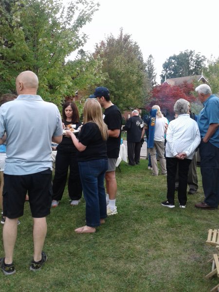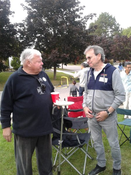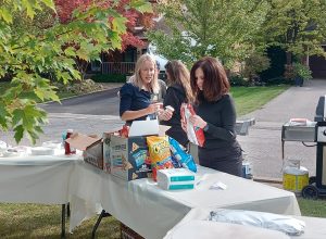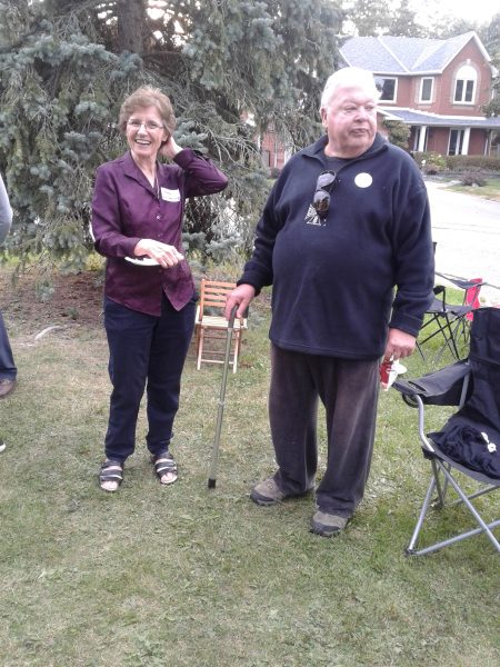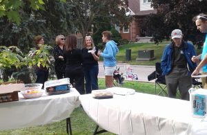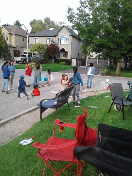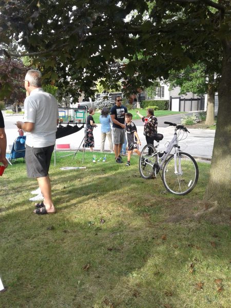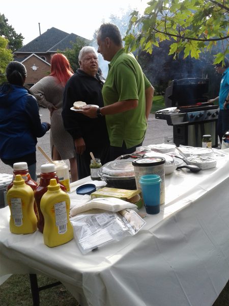 The grassy court at the foot of the street was turned into party central: mini-basketball hoops for the kids, a badminton net for the active adults, propane barbecues, benches and chairs, and tables laden with homemade potluck foods. Two neighbourhood guys, Steve and Darryl manned the bbq’s smokin’ up hot dogs, hamburgers and brats. Table foods went beyond just the basics with Robert’s homebaked pizza, Nadia’s 5-bean medley salad, Kathy’s Macedonian cookies converted to Canadian deliciousness and many other eatables satisfied the hunger pangs of neighbourhood attendees.