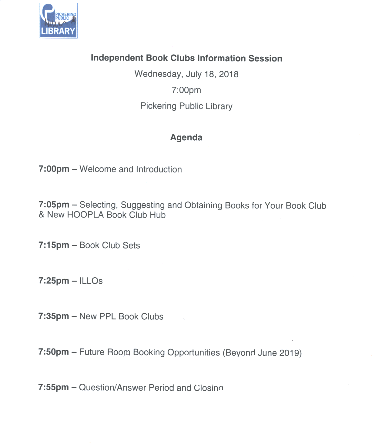 The Pickering Public Library reviewed that current book clubs would continue to have their allocated meeting spaces as assigned until June 2019. After this time, these clubs would be responsible for applying for available spaces at the library and/or the city.