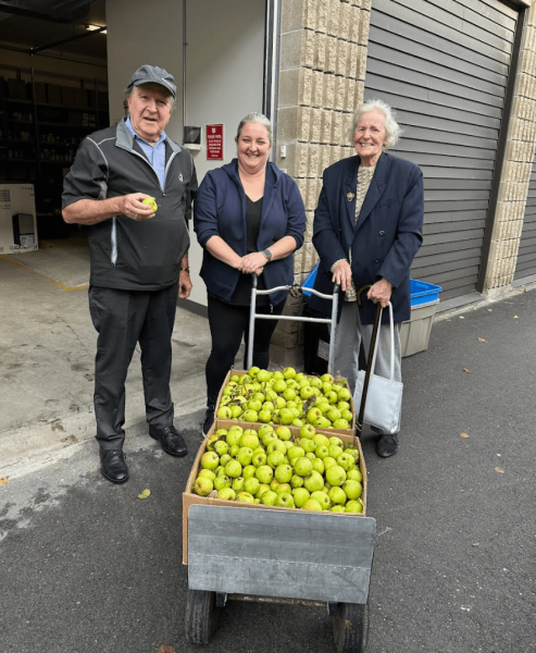 Pres. Paul White and FBNA exec Pat Perry deliver almost 200 lbs of apples to Lindsey Morrill of St. Paul on the Hill Food Bank