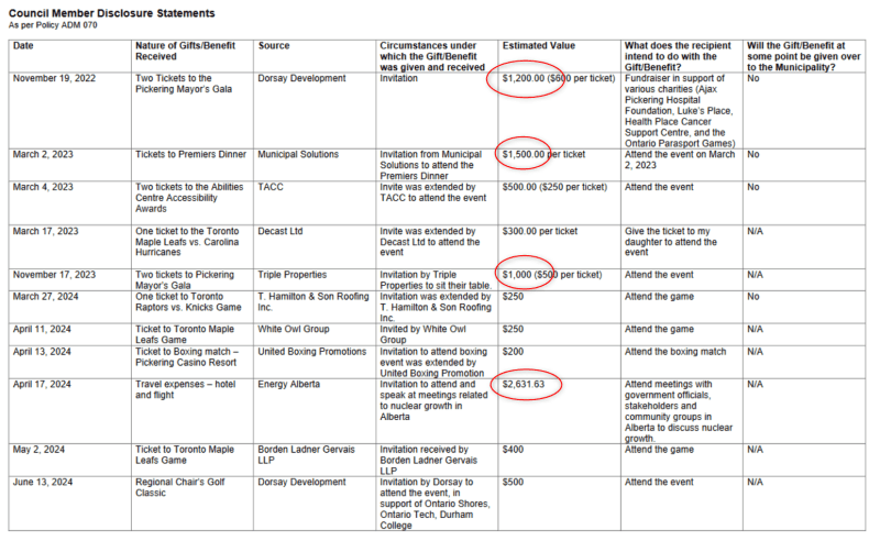 Hello all, below is an email that was sent out June 30, 2024 that shows gifts given to Pickering Mayor Kevin Ashe as posted in the Pickering.ca web site. You will find that “Borden Ladner Gervais LLP Ticket to Toronto Maple Leafs Game $400 May 02, 2024” gifted Kevin Ashe a ticket to the Toronto Maple Leafs game. Consequently, today the City of Pickering released a statement concerning both the City of Pickering and Ajax regarding Elexicon Holdings. Apparently the same law group Borden Ladner Gervais LLP is now retained by the City of Pickering and Ajax. Coincidence??