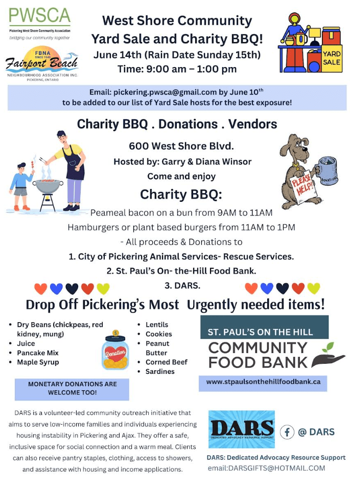 PICKERING: WEST SHORE COMMUNITY Yard Sale & BBQ, June 14, 9:00-1:00pm