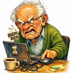 The correction took less than 45 seconds to regenerate but it gave me the result I wanted, a caricature of a senior frustrated with computer use.