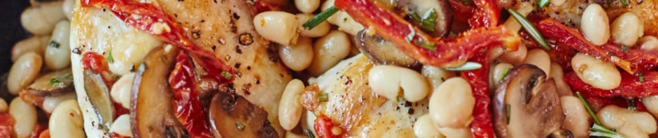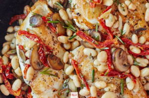 The chicken breasts are seared in a large skillet, then you sauté a flavorful mix of mushrooms, sliced sun-dried tomatoes, garlic, rosemary, and cooked white beans right in the same skillet.