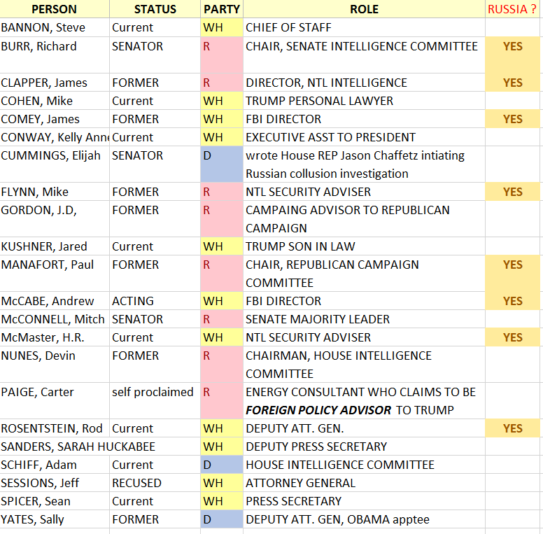 To simplify the task, below is a chart which labels the main characters briefly describing their role or relationship to Trump and if they have a role in the investigation of Trump’s alleged collusion with Russia.